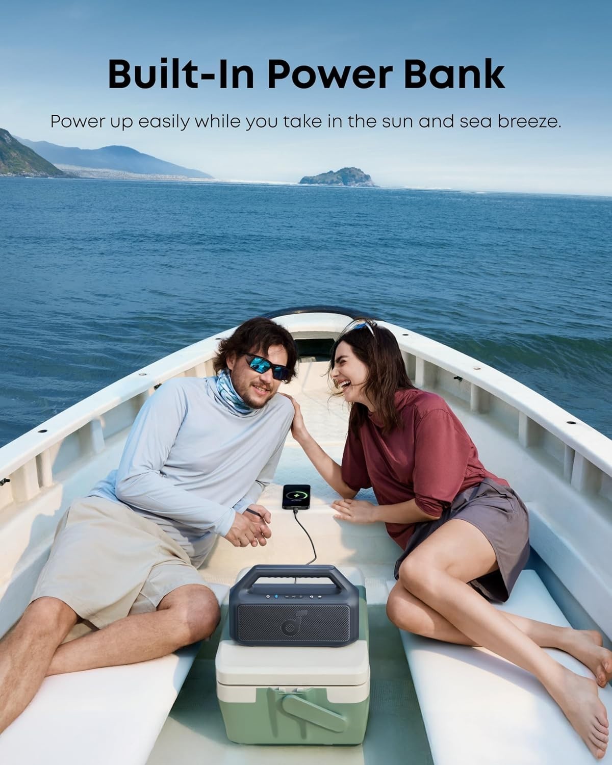 - Listen All-Day Anywhere: Boom 2 outdoor speaker keep the beats playing for 24 hours on a single charge, and with the built-in power bank, you can keep your phone powered up wherever you are. (Playtime may very based on volume level and playback content.)