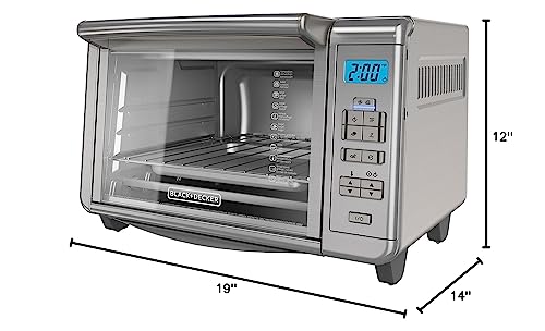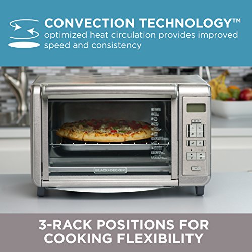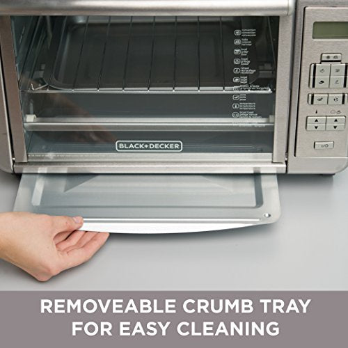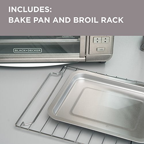 Details: At-home cooking just got easier with the BLACK+DECKER 6-Slice Stainless Steel Digital Convection Countertop Toaster Oven with Broiler Pan. With a large interior and 20% faster* cooking times than previous models, the seven dedicated cooking functions quickly perfect everything from 12”pizzas to reheated leftovers. Intuitive digital controls make it easy to set the time, temperature, and cooking function, and the 120-minute timer features stay-on and auto-shutoff functionality. Convection technology circulates air within the oven for fast and even results while baking. Plus, the toaster oven includes a broiler pan and an external crumb tray that slides in and out, making cleanup a breeze. When it’s time to eat, trust the #1 brand in toaster ovens**—BLACK+DECKER. *Compared to BLACK + DECKER TO1660B. Three rack positions bake an entire chicken or finish steaks right under the broiler! The included rack slides in to three different positions for flexible cooking. Bake/broiler pan don’t worry about finding pans to fit in the oven. The included baking/broiling pan fits perfectly, making it easy to insert and remove food. Toasting rack also included.