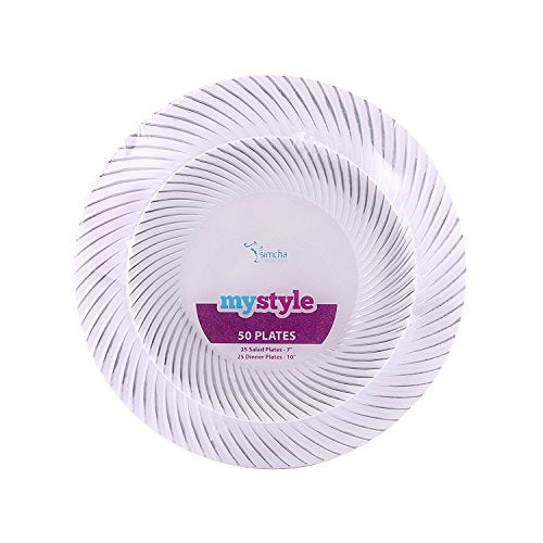 - Bundle of 50-piece Mystyle collection, china like white and silver plates, 25-7.5" Plates and 25-10.25" Plates