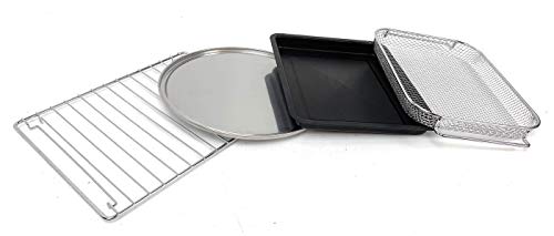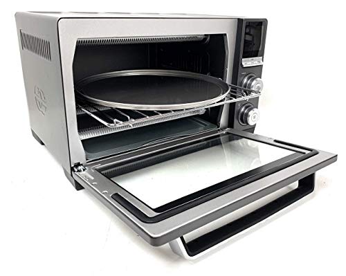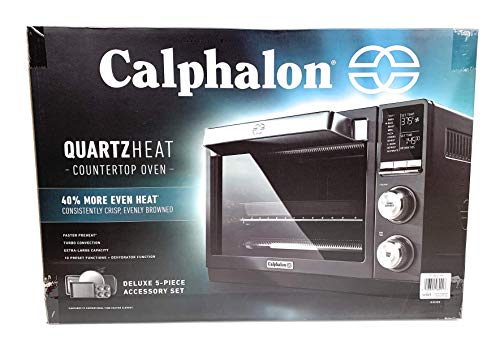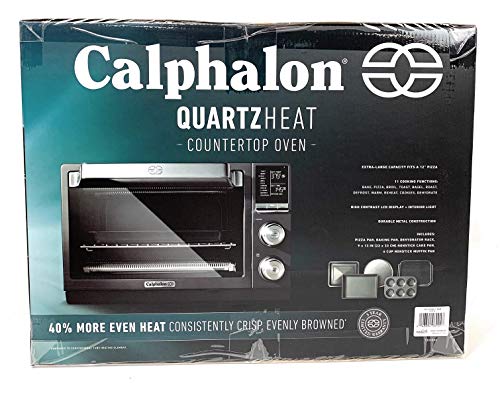 Details: The Calphalon Quartz Heat Countertop Oven provides 40% more even heat, it preheats in seconds with a high contrast LDC display. It has 11 cooking functions including; Bake, toast, bagel, roast, defrost, warm, reheat, and dehydrates. Extra large capacity, fitting a 12" pizza. This countertop oven is�stainless steel and durable metal construction. Baking pan, Pizza pan, and dehydrator rack included..