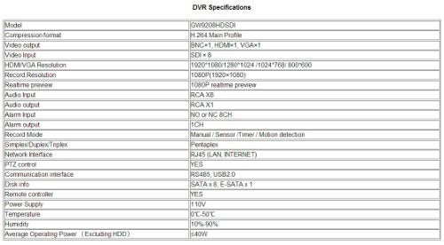- GW9208HDSDI: HD-SDI High Definition 8 Channel DVR, 1080P real-time preview, support 8HDD, support E-SATA, support LOOP. 8 alarm in/1 out. iPhone, Android Viewing. HDMI & VGA. Recording, playback, and network live, backup, USB2.0 Backup, PTZ Control