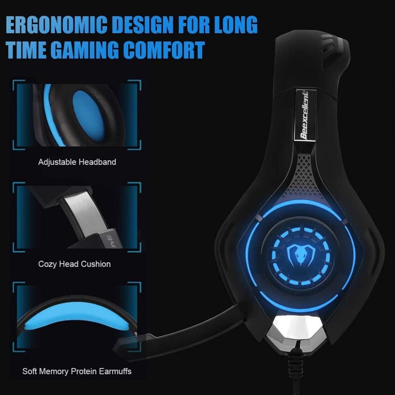 Beexcellent Gaming Headset for PS4, Xbox One Controller, PC, Over Ear Headphones with Noise Cancelling Mic, Soft Memory Earmuffs, LED Light, Stereo Bass Surround Sound for Nintendo Switch Laptop Mac