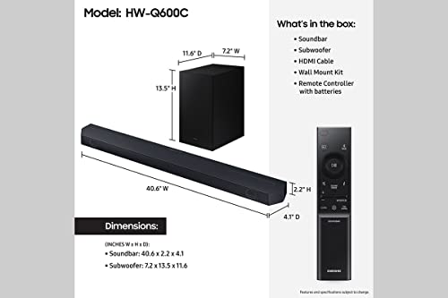 Details: Surround yourself in multi-layered surround sound with the Q700B. Enjoy Dolby Atmos sound from above and around without requiring HDMI cables. Experience immersive, cinematic experience with 3 channels, a powerful subwoofer, and 2 up-firing speakers. Sound is automatically optimized to fit your surroundings with SpaceFit Sound.** With Q-Symphony, the soundbar sound synchronizes with all of the internal speakers in your compatible Samsung TV to enrich the audio even further. And if you need to adjust the volume or listen to your favorite song, just direct a simple voice command using your favorite voice assistant.*** Boost your gaming experience with up-firing speakers and 3D audio that moves all around you. Acoustic Beam® and powerful woofers automatically sync sound with the action onscreen so you can react instantly in real time.***** *Q-Symphony is compatible with select 2020 - 2022 Samsung TVs. Please refer to samsung.com for more information. Soundbar must be connected to TV via HDMI to enable Q-Symphony function. **SpaceFit Sound is compatible with 2021 Samsung QLED TV's (Q70↑ and above). Please refer to samsung.com for more information. ***An Amazon Echo Device is required to use this feature. This service is provided by Amazon and can be terminated at any time. Amazon, Alexa, and all related logos are trademarks of Amazon.com, Inc. or its affiliates. Some features and functions provided by connected devices may be limited or not be supported to use. Content Services may vary by region & are subject to change without notification. ****This Samsung soundbar supports AirPlay2 and requires iOS 11.4 or later. Apple, and AirPlay are trademarks of Apple Inc., registered in the U.S. and other countries. *****Compatible with select TVs and select gaming consoles (e.g. Xbox X, PS5). Game console sold separately.