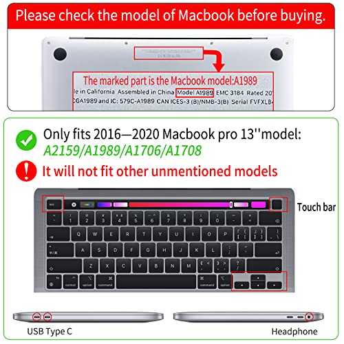 - ❤COMPATIBILITY:This case is ONLY compatible with Macbook Pro 13 inch Case 2020 2019 2018 2017 2016 Release M1 A2338/A2289/A2251/A2159/A1989/A1706/A1708.Please kindly check the model number (AXXXX) at the bottom of your Macbook to determine the compatibility and refer to the attached picture to see if the model number is compatible with your Macbook.