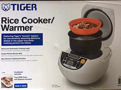 Details: Cuenta con el sistema "tacook" de Tigre: cocina arroz perfecto mientras vaporiza platos en la bandeja superior.