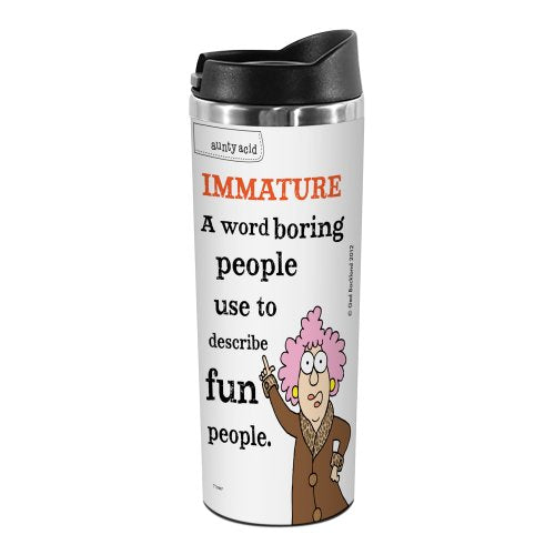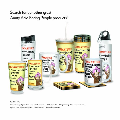 Details: Description Tree-Free Greetings strives to use the most eco friendly materials and processes possible. Printed and assembled in the USA, The Tree-Free Greetings 18-8 Double Wall Stainless Artful Tumbler is vibrantly printed with hard to find Boring People themed art and is great for everyday use. This premium quality 14 ounce tumbler is printed with VOC-free, solvent-free water-based dye and will stay vibrant for the life of the product. It's reusable, reducing waste from disposable coffee cups. BPA free and Proposition 65 compliant, this high quality tumbler has an elegantly curved no spill ergo-lid and fits perfectly into a car's cup holder. The Tree-Free Greetings 18-8 Double Wall Stainless Artful tumbler keeps beverages piping hot for hours and makes the perfect gift or souvenir. Save trees and spread joy. Buy a Tree-Free earth-friendly gift today. Aunty Acid - Wickedly Funny humor from Backland Studio. Search for more great humor on more great items on Amazon.